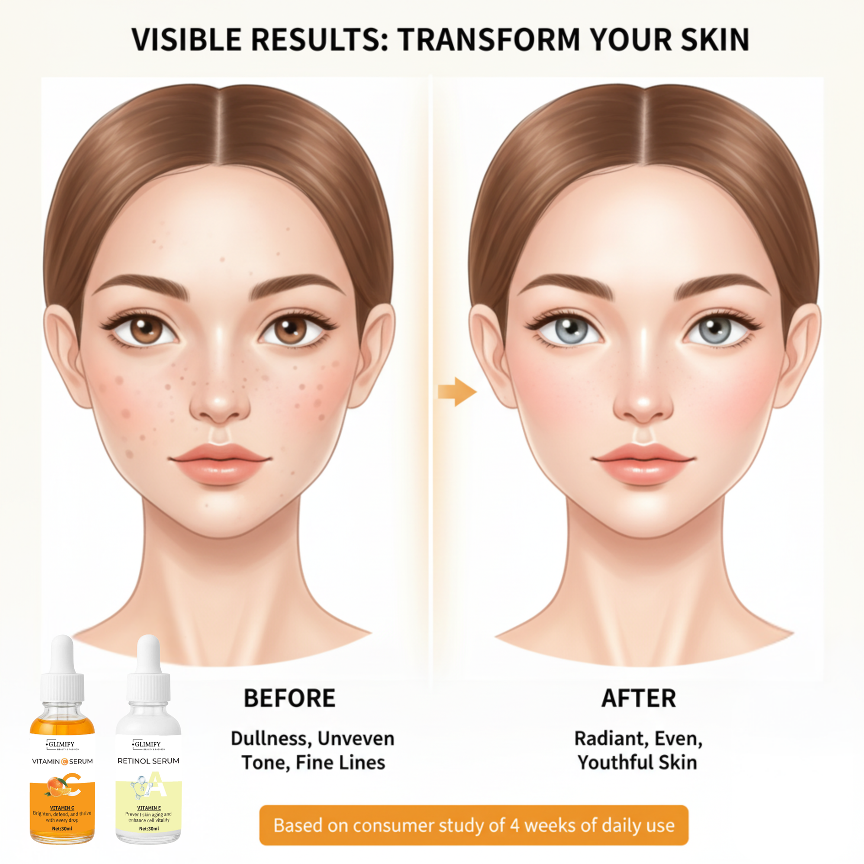 Transform your skin with Vitamin C + Retinol Serum. This powerful serum combines the brightening benefits of vitamin C with the anti-aging properties of retinol to reduce dark spots, fine lines, and wrinkles. Perfect for all skin types, it leaves your skin looking radiant, smooth, and youthful. Achieve a glowing complexion with this must-have addition to your skincare routine!